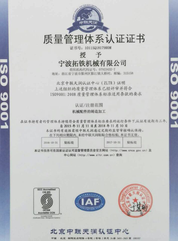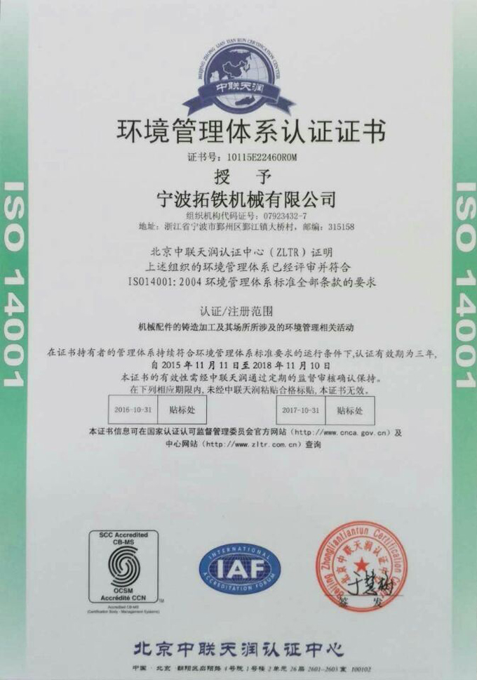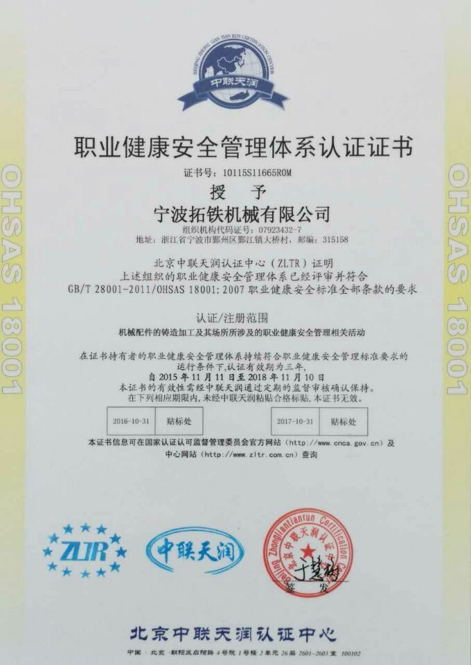 2015年11月,拓铁机械获得国家ISO9001质量管理体系认证,ISO14001环境管理体系认证和OHSAS18001职业健康安全管理体系认证。