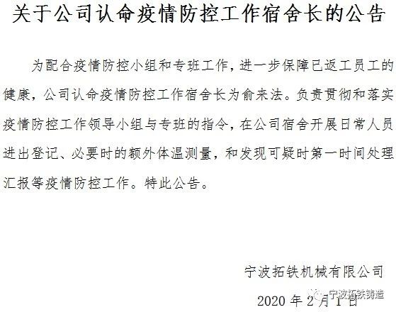 我们共同期望本次疫情立即解除,百姓安康、国家昌盛。相信风雨后总会有彩虹。我们在此再次呼吁拓铁的全体员工们,一定要牢记和贯彻政府与公司的疫情防控原则,众志成城,一起打赢本次的疫情战。