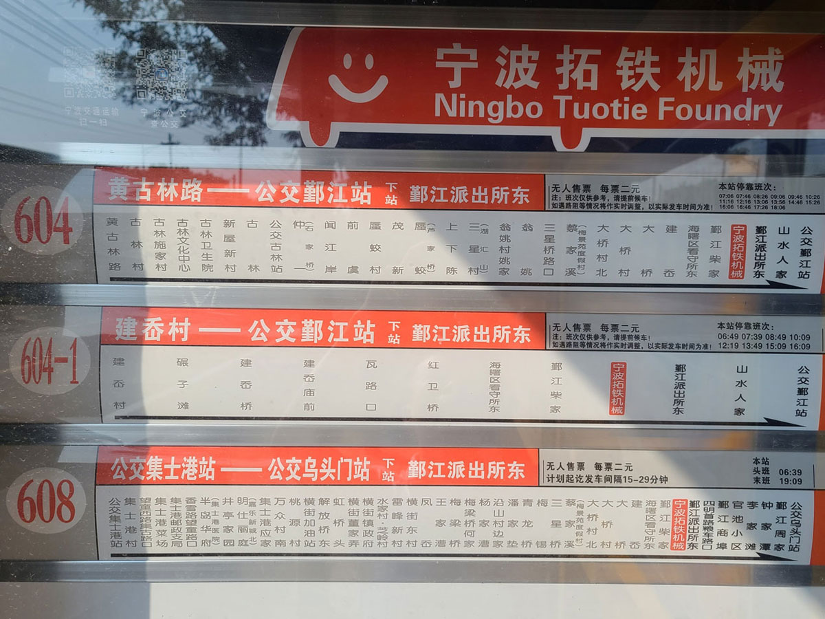 近期,位于宁波市海曙区鄞江镇大桥村的“拓铁机械”公交车站投入运营,正式并入3条公交线路:604路、604-1路、608路。这将进一步为宁波拓铁机械有限公司广大员工及家属们的日常出行提供便利。